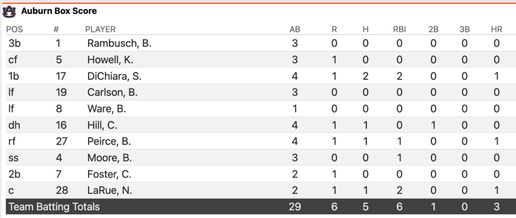 Auburn extended the lead to the eventual final of 6-3 on DiChiara’s previously mentioned two-run homer in the bottom of the eighth.