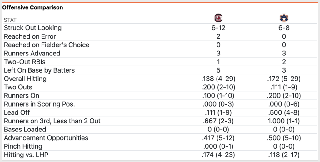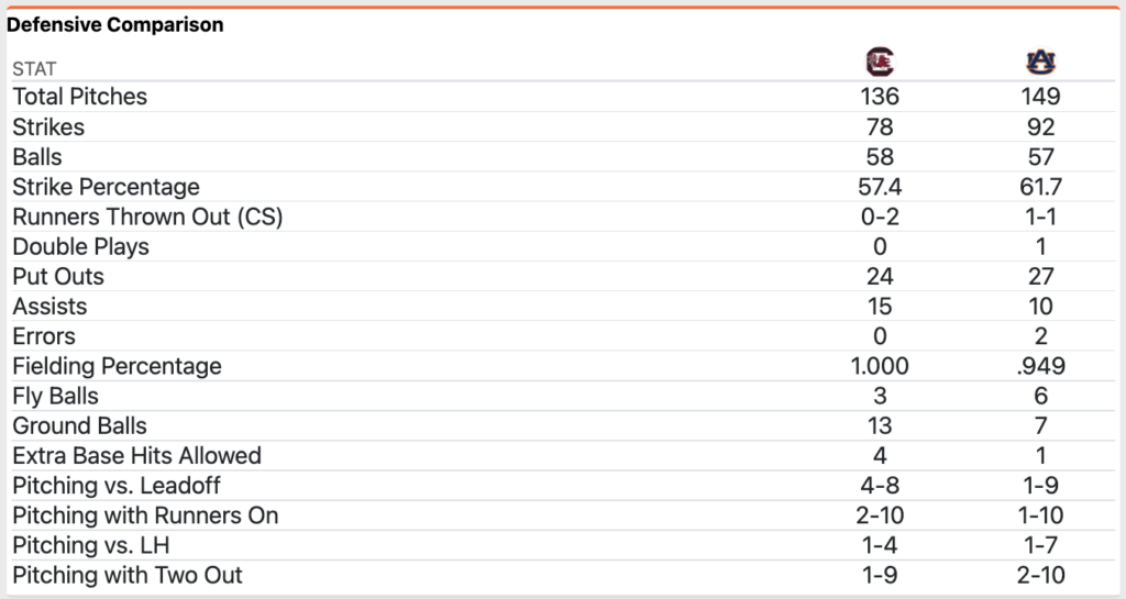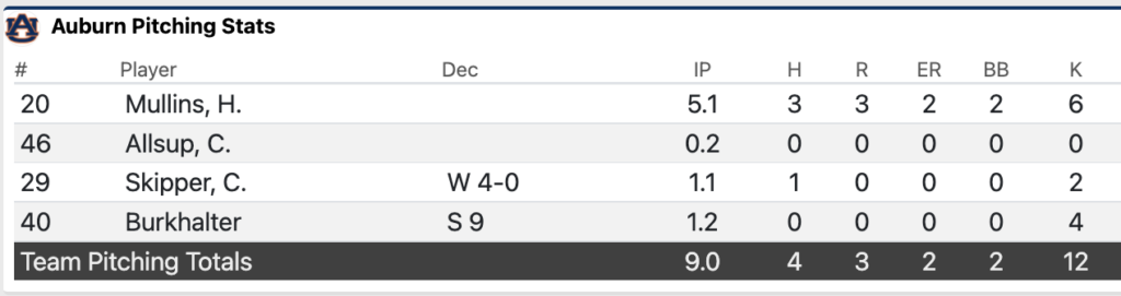 Auburn’s bullpen held South Carolina scoreless and to just one hit in the final 3.2 innings. Carson Skipper (4-0, 3.18) earned the win in 1.1 scoreless innings while Blake Burkhalter retired the final five batters with four strikeouts to earn his league-best ninth save.