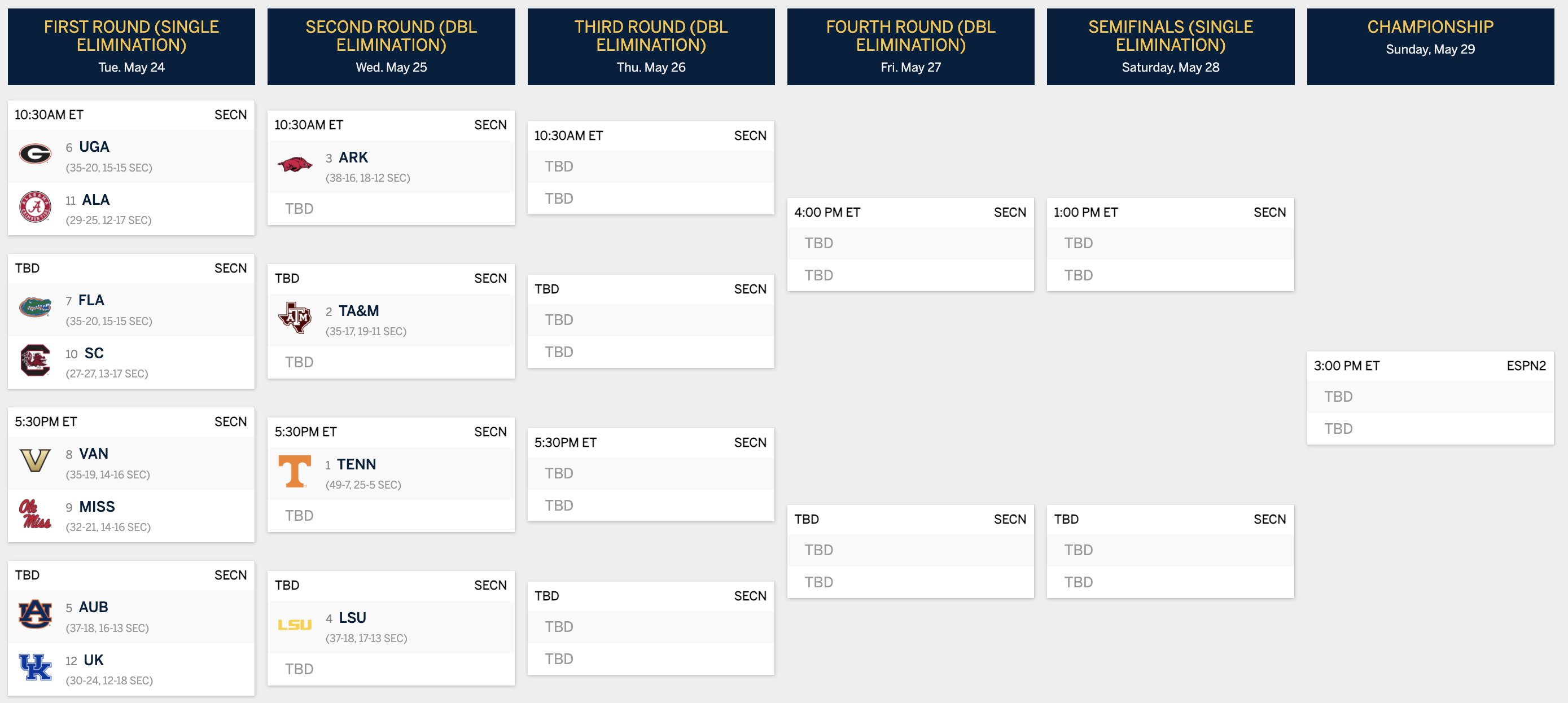 Single-elimination action begins with four games on Tuesday, with double-elimination play beginning Wednesday. Once the tournament is whittled down to the final four teams the format returns to single elimination. The SEC Network will televise all the action prior to Sunday’s 2 p.m. championship game, which will air on ESPN2.