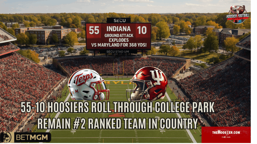 The No. 2-ranked Indiana Hoosiers continued their dominant run through the 2025 season, leaving no doubt in College Park with a 55–10 rout of Maryland on Saturday in front of a sold-out Homecoming crowd at SECU Stadium.