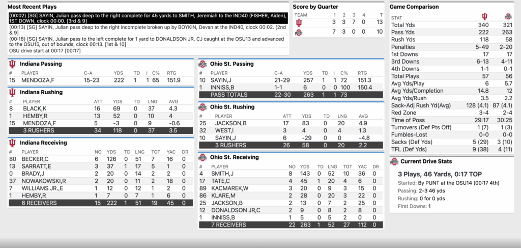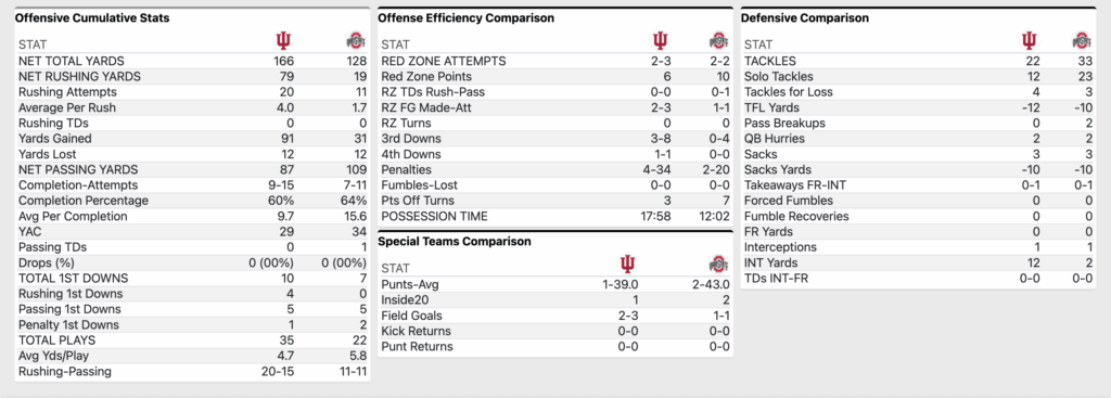 Ohio State went over 80 yards down the field but were stopped on 3rd and 1. Jayden Fielding’s 27 yard field goal attempt is wide left and the Hoosiers take over at their own 20.