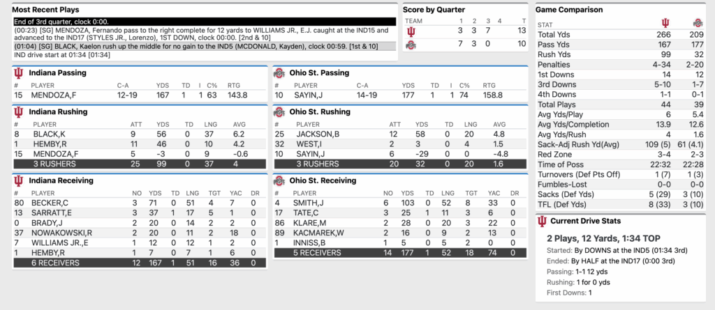 END of 3Q: No. 2 Indiana Football 13, No. 1 Ohio State 10