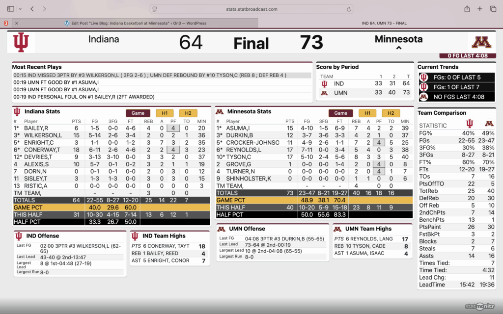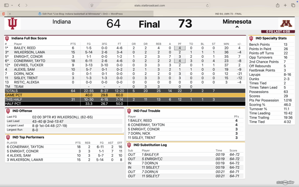 Live Blog: Final: Minnesota 73, Indiana basketball 64