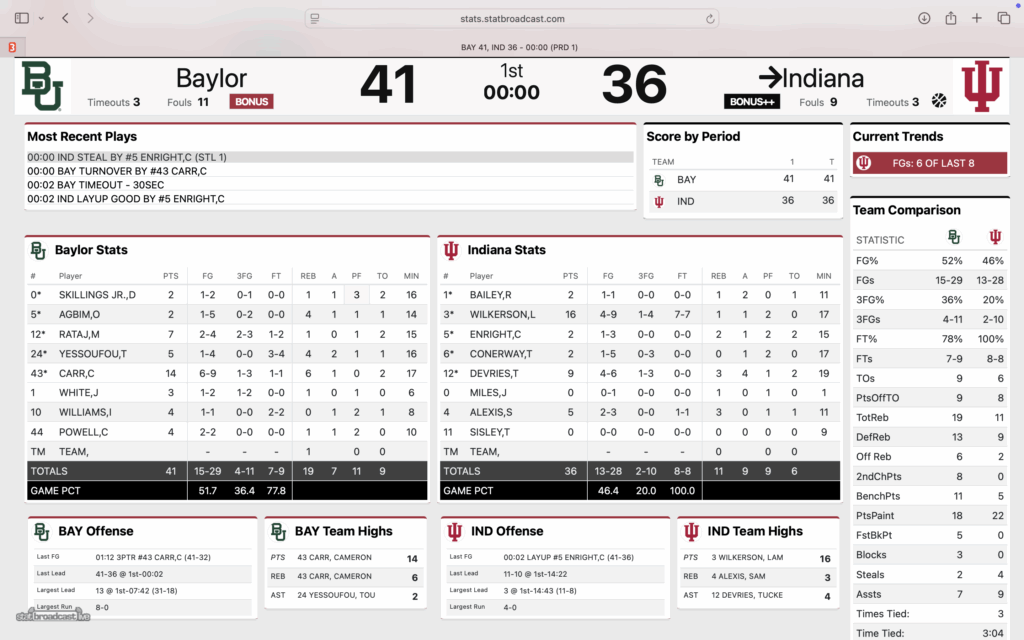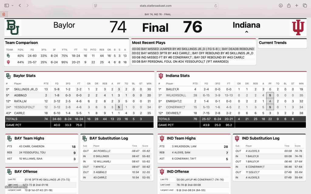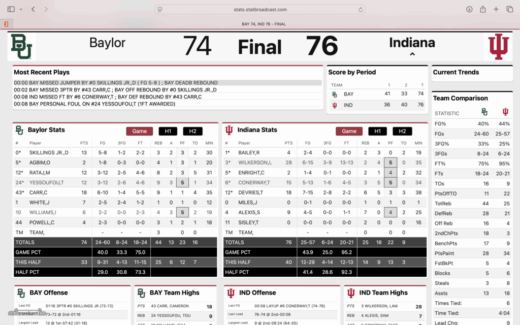 Hoosiers start to get on a run. Cut the lead down to 6 heavier Baylor hit a three and then had a dunk to extend the lead back to 9.