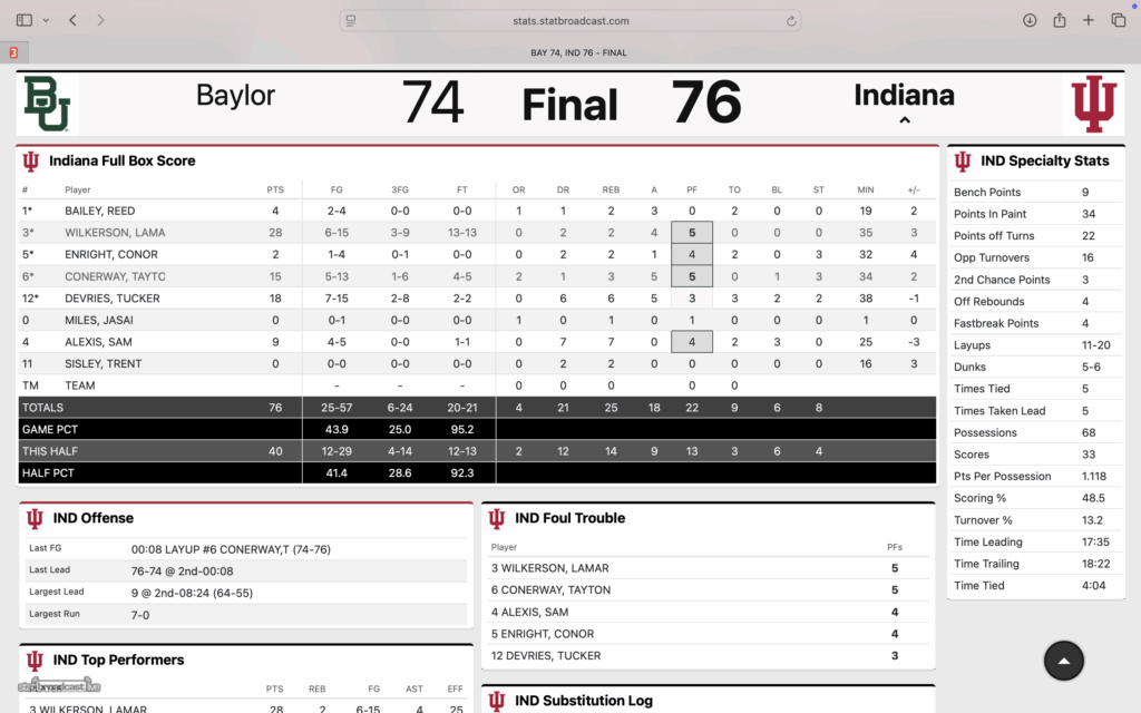Live Blog: Final - Indiana basketball 76, Baylor 74