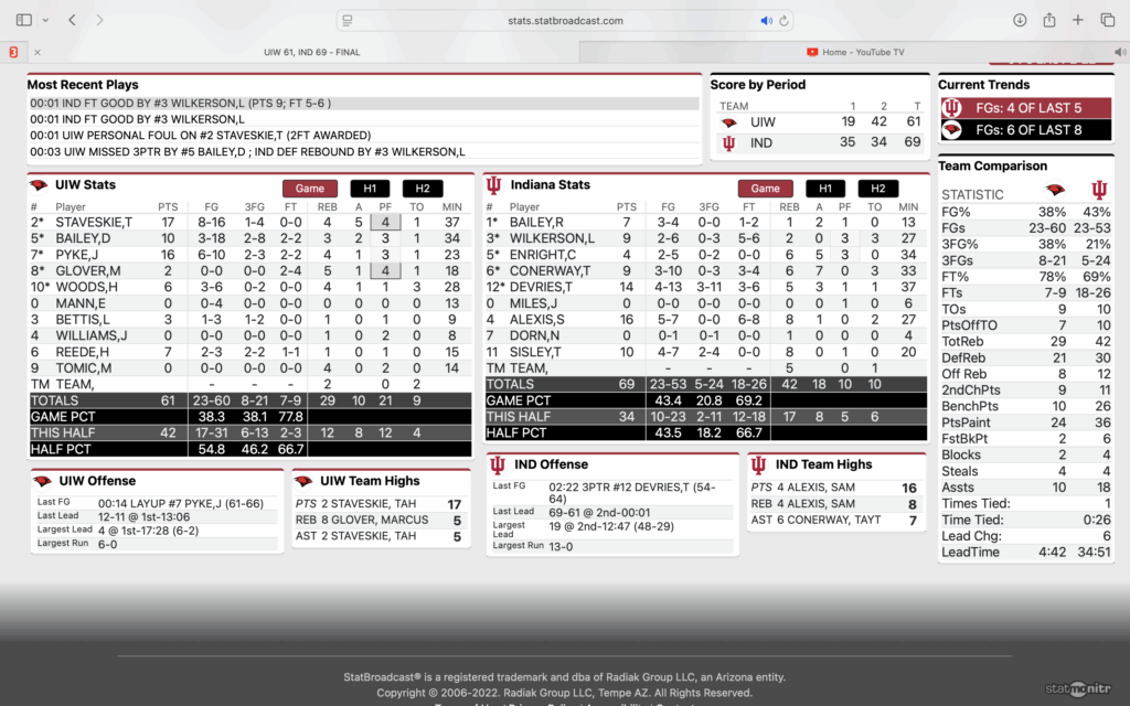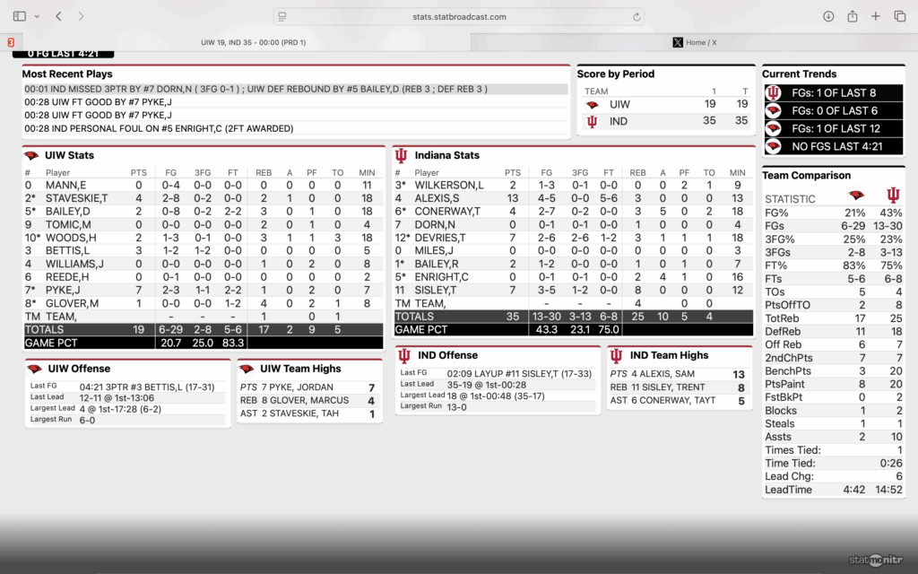 Indiana basketball on a 6-0 run currently. 2:41 scoring drought for UIW.
