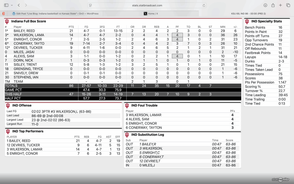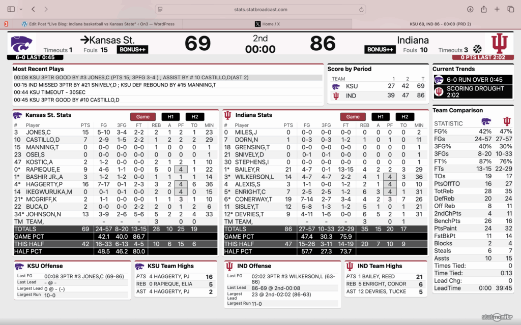 6-0 run by Indiana basketball, 2:33 scoring drought for K-State.