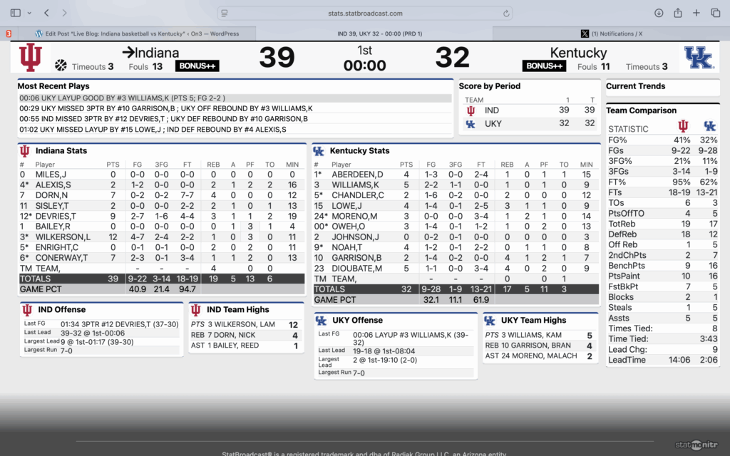 Media timeout at 3:54: Indiana basketball 26, Kentucky 25