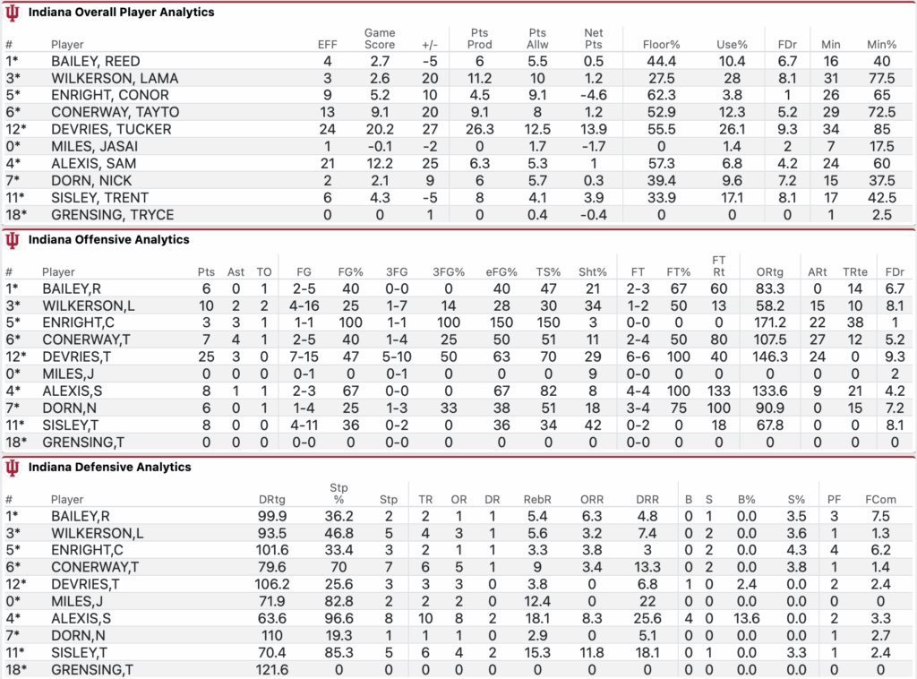 Last made field goal for Indiana was at the 4:14 mark in the first half. Sam Alexis however break the skid finally.