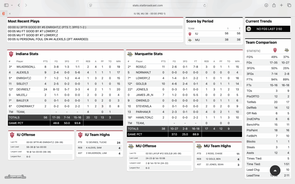 11/09/2025 01:39:09 PMMarquette cuts the lead down to just 12. Indiana getting beat on defense and have a 2:00+ scoring drought.