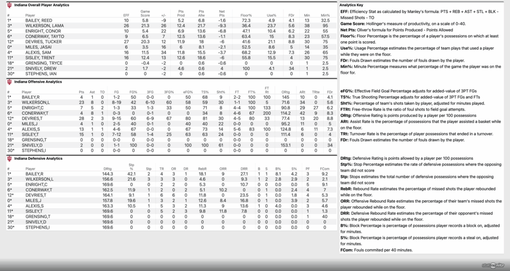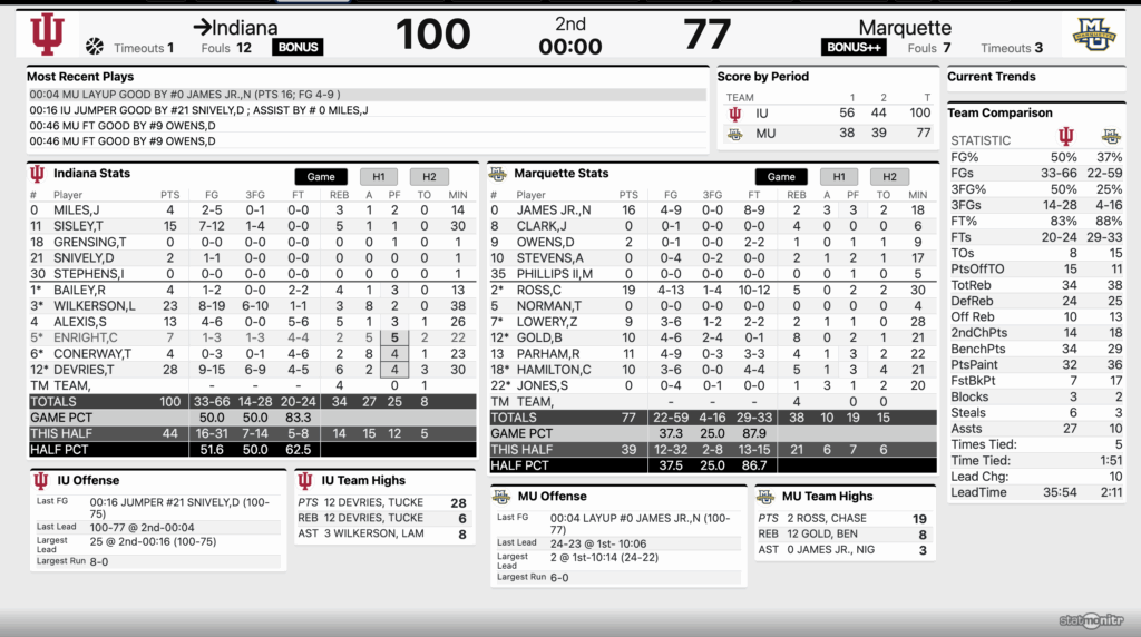 DeVries would hit his 3rd three of the game. Then he would get a steal and find Sisley for the dunk on the fast break. Enright would drawn an offensive foul too. Momentum on Indiana’s side right now.