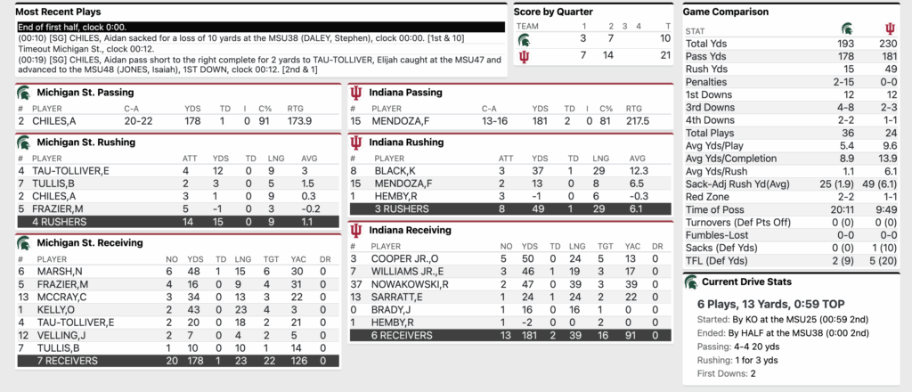 10/18/2025 04:35:38 PMQ3 15:00: Indiana Football 21, Michigan State 10