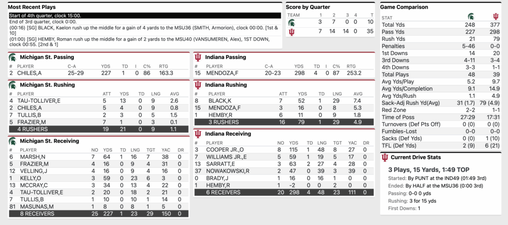 10/18/2025 05:00:36 PMQ3 3:55: Indiana Football 35, Michigan State 10