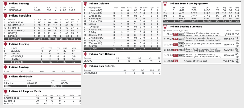 Hoosiers take no time to open the half as Fernando Mendoza finds Omar Cooper Jr. for a 48 yard touchdown. It’s Mendoza’s third touchdown pass of the game all to different receivers. Four play 75 yard drive for Indiana.