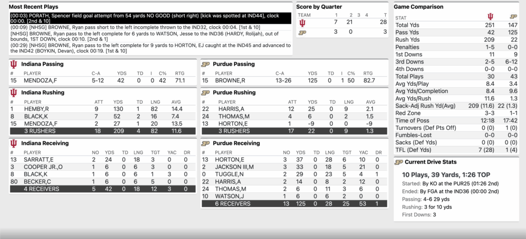 The Purdue defense has no answers for the Indiana rushing attack. The Hoosiers have 209 rushing yards and four touchdowns on 11.6 yards per carry. This time it was Roman Hemby breaking off a massive 82 yards score.
