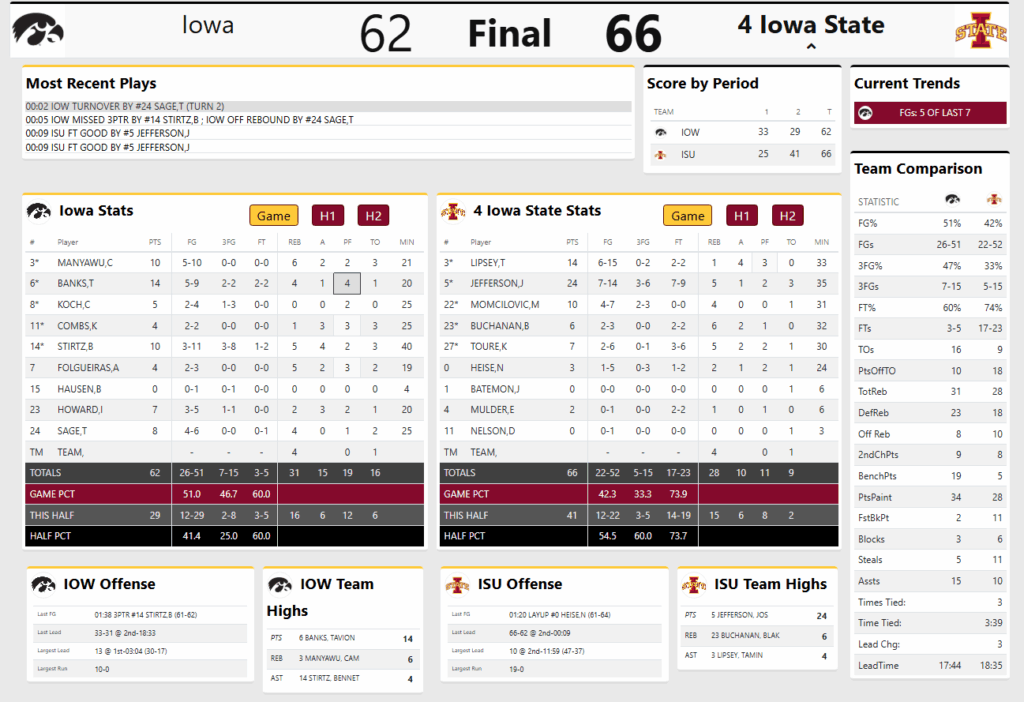 Momentum flipped right out of the gates in the second half, with ISU going on an extended 22-4 run to build a double-digit lead at the under 12 timeout. Iowa responded with an 8-0 run to cut the deficit to 47-45. The two sides went back-and-forth down the stretch, but the Hawkeyes could never draw even. A one-possession game in the final seconds, Joshua Jefferson drew a foul and made both at the line to clinch the win for ISU.