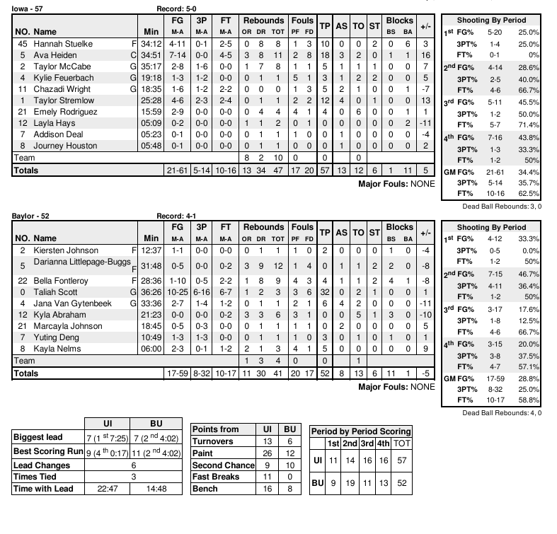 One of the basketball games of all time. It was messy, it was physical and it looked bleak for Iowa at times, but they found a way. In their first big test of the season, the 19th-ranked Hawkeyes were able to grind out a 57-52 win over 7th-ranked Baylor to move their undefeated start to 5-0.