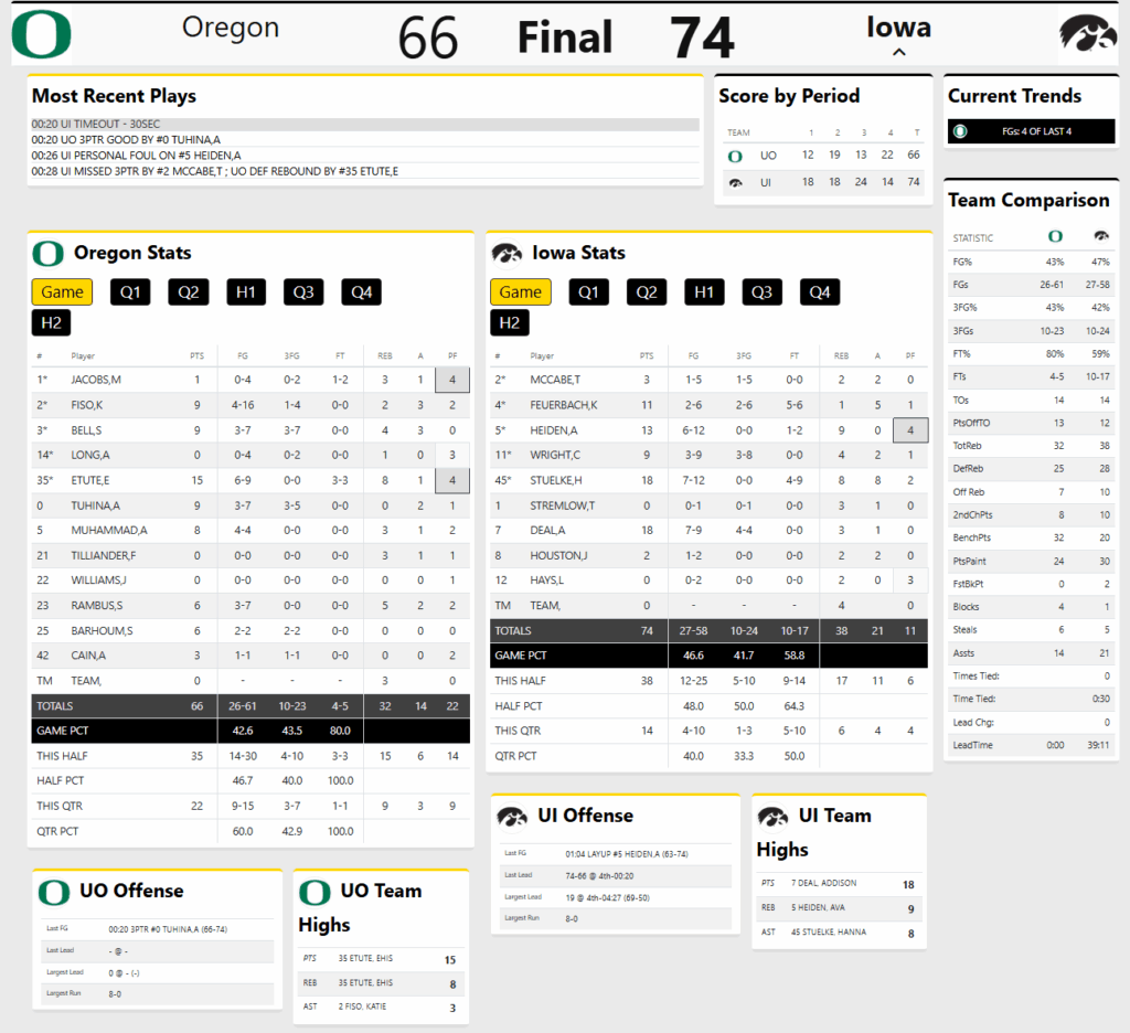 A high energy game from the opening tip, it took some time for the two sides to settle in offensively, with Iowa jumping out to an 18-12 lead after ten minutes. The Hawkeyes opened up a 12-point lead in the second quarter, but couldn’t get it to the half, with the Ducks closing on a 14-7 run to pull within 36-31 at the break. The lead grew in the third quarter, and a 14-5 run put Iowa ahead 60-44 going into the final quarter. Oregon made some garbage time buckets to make the score look closer than it really was.