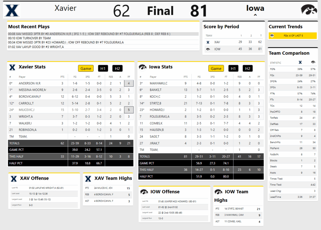 It was a less than stellar start for the Hawkeyes, turning it over five times over the first 11 minutes, while the visiting Musketeers knocked down five threes to stay within 27-25. However, Xavier committed 13 fouls in the first half, which caught up with them eventually. Iowa ended the half with a critical 18-4 run that included seven made free throws and took a 45-29 lead into the locker room. Early in the second half, a Cooper Koch intentional foul turned 6-point possession allowed Xavier to cut the deficit to 47-38, but the Hawkeyes responded with a 7-0 run and the lead never got below 14 points the rest of the way.