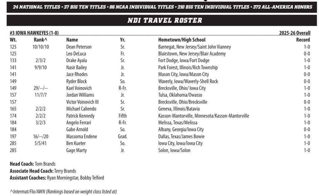 Iowa’s travel roster features all 10 starters from last week’s 40-0 dual victory against Bellarmine.