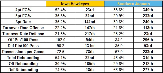 OFFENSE: IOWA: 74.4 PPG, 46.4% FG, 35.3% 3PT, 16.1 TO SOUTHERN: 59.3 PPG, 37.5% FG, 29.5% 3PT, 14.9 TO