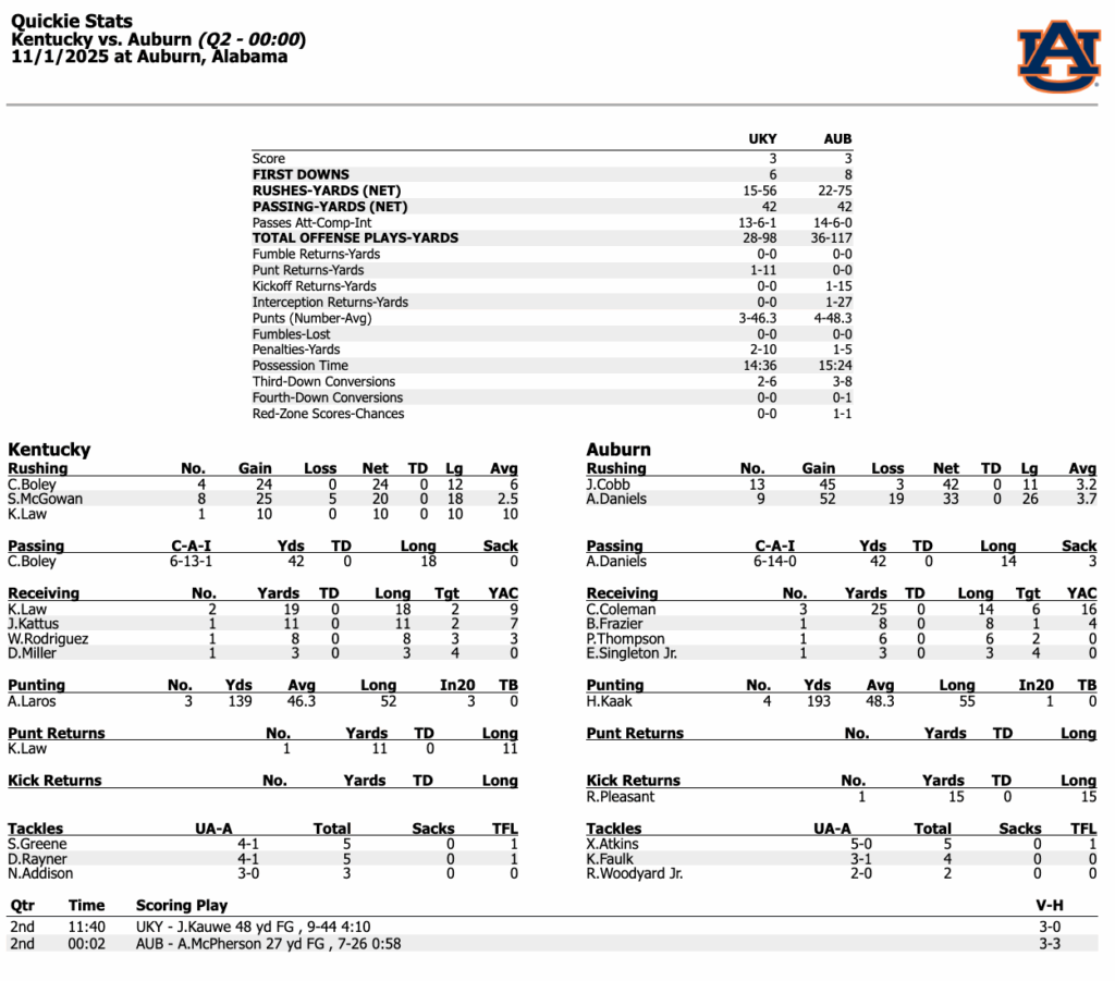 The Wildcats’ defense looked good for most of the half, forcing five tackles for loss and three sacks before a costly turnover flipped the momentum late. Boley was intercepted while driving before halftime, and Auburn returned it to the 35, setting up the Tigers’ first scoring opportunity. Ashton Daniels and Jeremiah Cobb pushed Auburn inside the 10-yard line as the clock ticked away, but Kentucky’s defense held strong, forcing a short Alex McPherson (Evan’s little brother) field goal to tie it just before the break.