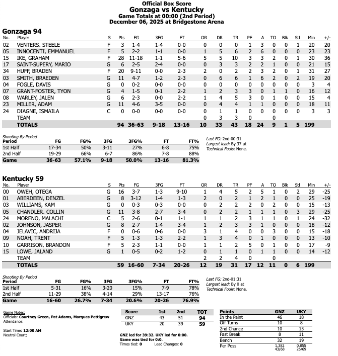 FINAL: An abysmal Kentucky performance leads to 94-59 blowout loss vs. Gonzaga