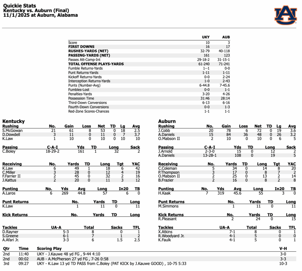 Daniels returned for Auburn’s final drive and strung together a few late completions, including a third-down throw to Cam Coleman and a 19-yard gain to Preston Howard to reach the Kentucky 35. But the comeback effort stalled there, as JQ Hardaway broke up a pass near the sideline with less than 30 seconds left. Daniels finished 12 of 22 for 96 yards and 87 rushing, and the constant quarterback shuffle summed up Auburn’s night. Kentucky’s Jordan Lovett intercepted Daniels’ last pass.