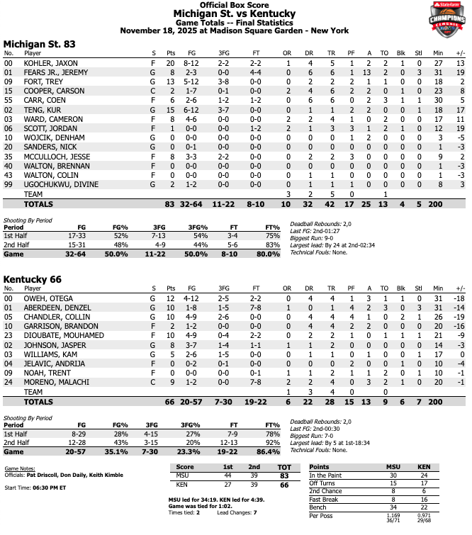 Kentucky was outplayed in nearly every major statistical category, including the coaching matchup against Tom Izzo. Jaxon Kohler posted 20 points on 8-12 shooting for Michigan State, while Kur Teng added 15 points and Jeremy Fears Jr. dished out 13 assists. No Wildcat scored more than a dozen points as the team shot just 35.1 percent from the field and 7-30 from the arc.