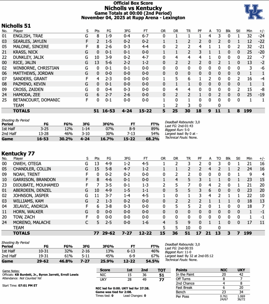 Nicholls was held to just 30.2 percent shooting for the game, including a 4-24 clip from three-point range. Only two players for the Colonels, Jalin Rice and Jalik Dunkley, reached double-digits with 13 and 10 points, respectively. Kentucky dominated the glass (51-30), but a 12-22 mark from the free-throw line on the night left some to be desired.