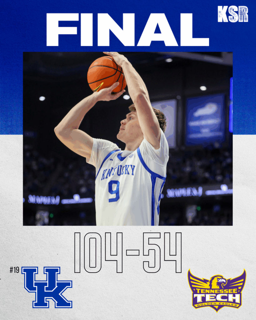 On Wednesday night in Lexington, the No. 19 Wildcats (5-2) shook off a slow start against the Tennessee Tech Golden Eagles (3-4) before cruising to a 104-54 victory. At one point in the first half, the score was tied at 25. But Kentucky kicked it into gear from there and cruised to another blowout win at home. Not even a return to Rupp for Tennessee Tech head coach John Pelphrey — a member of “The Unforgettables” Kentucky team in 1992 — could keep his group from ultimately being run out of the gym.