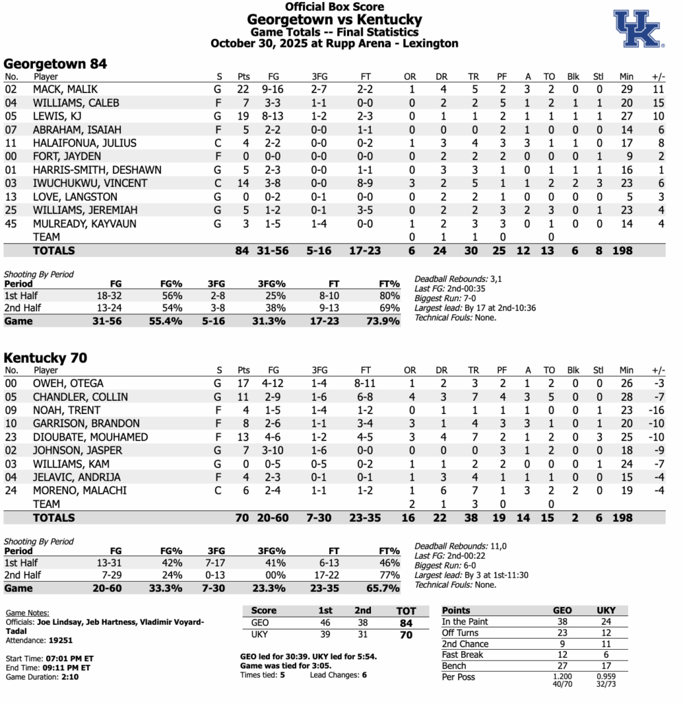 FINAL: Kentucky struggles in final exhibition, falls to Georgetown 84-70