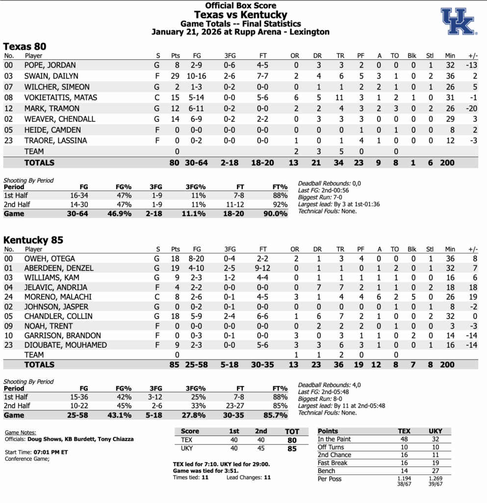 FINAL: Kentucky takes down Texas 85-80, wins 4th straight SEC game