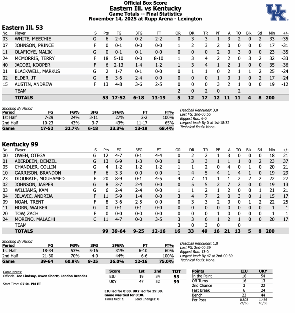 The No. 9 Wildcats (3-1) steamrolled Eastern Illinois (1-3) on Friday night in Rupp Arena, dominating from start to finish in a 99-53 beatdown. Kentucky was paced by a career performance from junior forward Mo Dioubate, who posted a 20-point, 11-rebound double-double on 8-9 shooting. Denzel Aberdeen and Otega Oweh chipped in 13 and 12 points, respectively, while Malachi Moreno went for 11 points and six rebounds. Andrija Jelavić also hit double-figures for the first time this season with his 11 points to go along with seven boards.