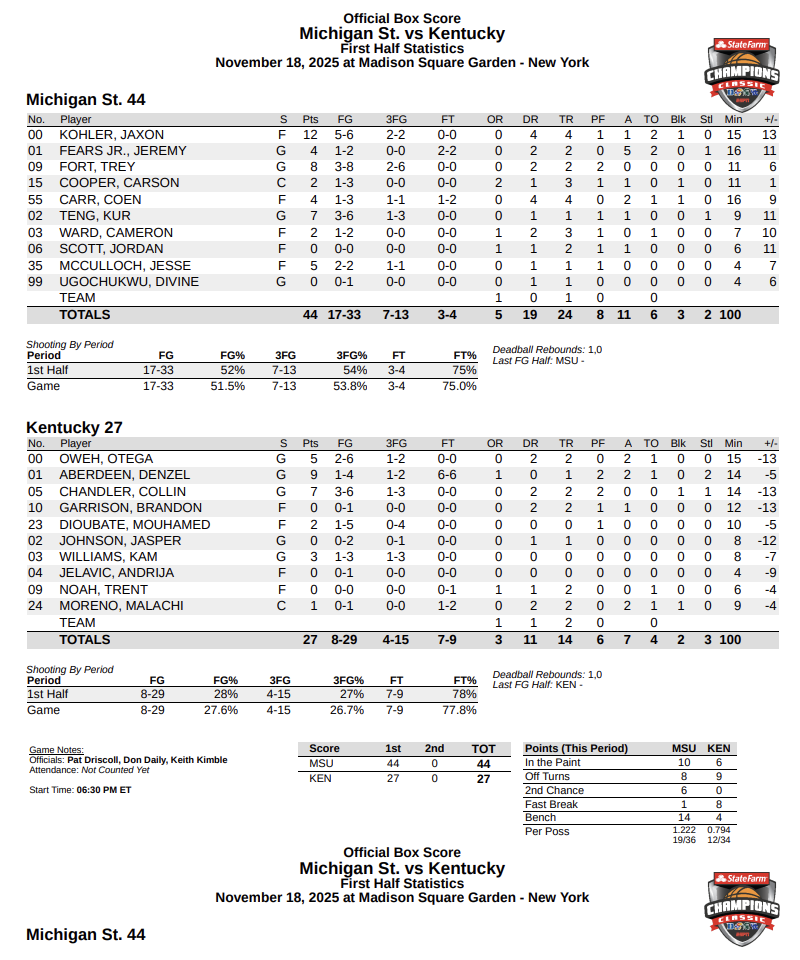 I know data-collecting is fun and the comeback efforts are great when they can pull them off, but this trend of Mark Pope coaching Kentucky teams to embarrassing first-half performances and praying for miracles down the stretch is not the way to go. It didn’t work against Louisville, and now, it doesn’t look like it’s gonna work against Michigan State, the Wildcats now down 44-27 at halftime and staring down the barrel of yet another inexcusable effort to open the season with the most expensive roster in the sport.