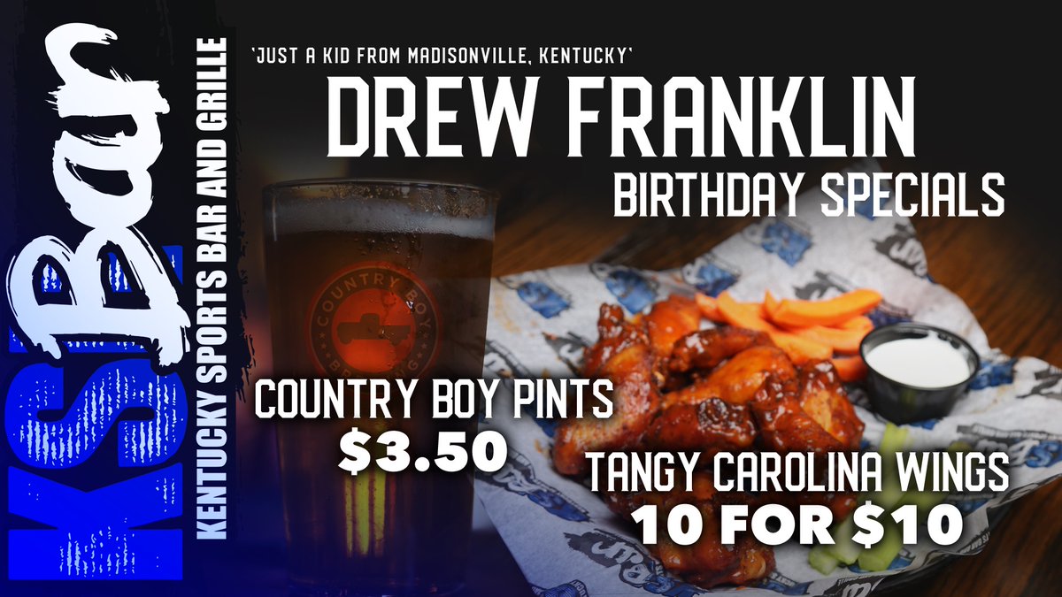 Today is Mr. Franklin's birthday. Instead of receiving gifts on his special day, Drew is giving you a gift at KSBar and Grille. Country Boy Brewing is taking over the bar's taps, offering pints for only $3.50 to help you wash down 10 Tangy Carolina wings for only $10.