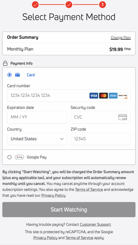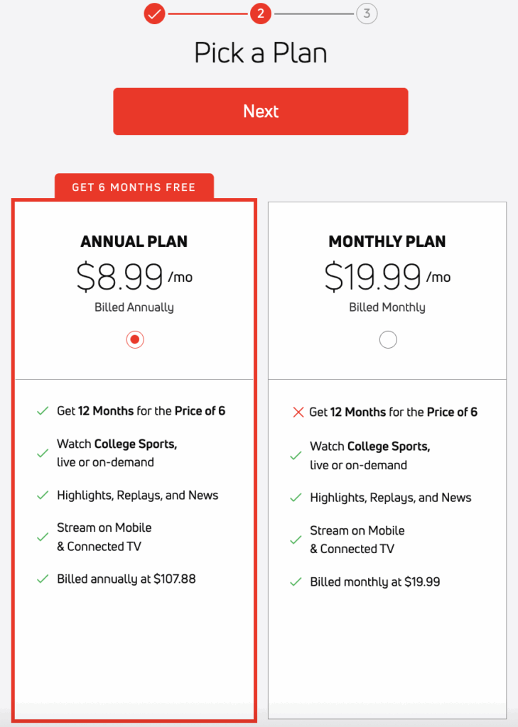 If you do the “GET 6 MONTHS FREE” plan, your first six months are not actually free. Instead, it’s just 50% off for the cost of a full year. You’ll be charged $107.88 when you complete the whole sign up process to watch the stream. That’s a ridiculous number for two ball games. Allow me to give you the less ridiculous option.