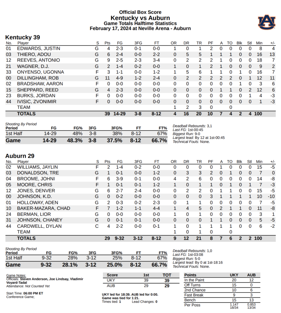 Outside of missed free throws, it’s hard to script a better first half for Kentucky. The Cats are shooting 48% from the floor while holding Auburn to 28%, 25% from three-point range. Another big stat? Kentucky has 15 points off six Auburn turnovers.