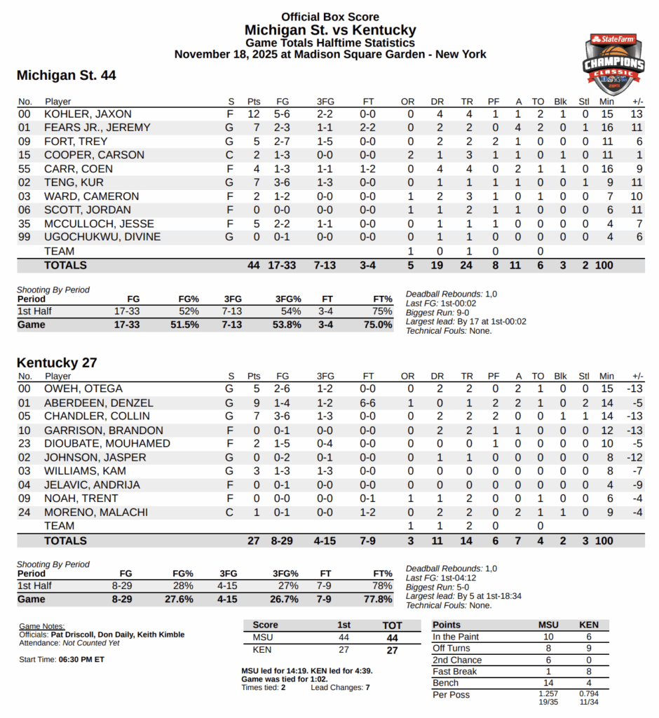 11/18/2025 05:44:50 PMKentucky is shooting 55.6 percent from the field and 60 percent from three while Michigan State is a blistering 66.7 percent from beyond the arc to start this one with four made threes. That’s the only reason the Spartans are staying alive at this point.