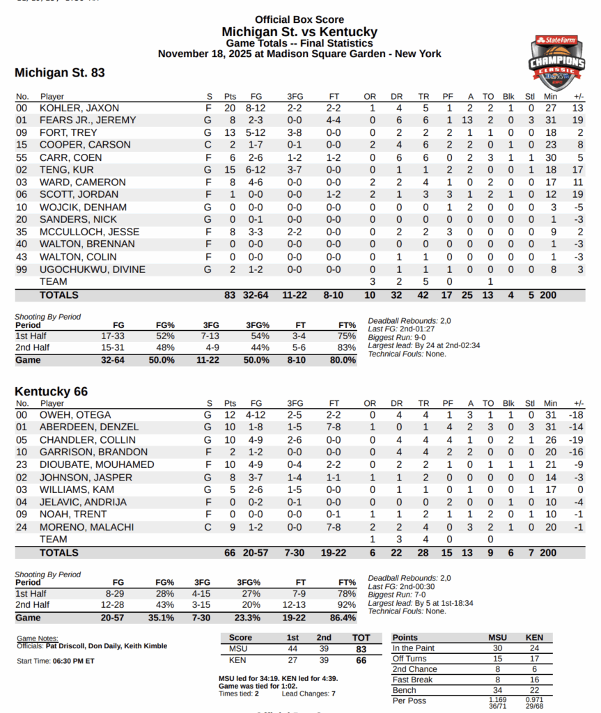 FINAL: Michigan State 83, Kentucky 66
