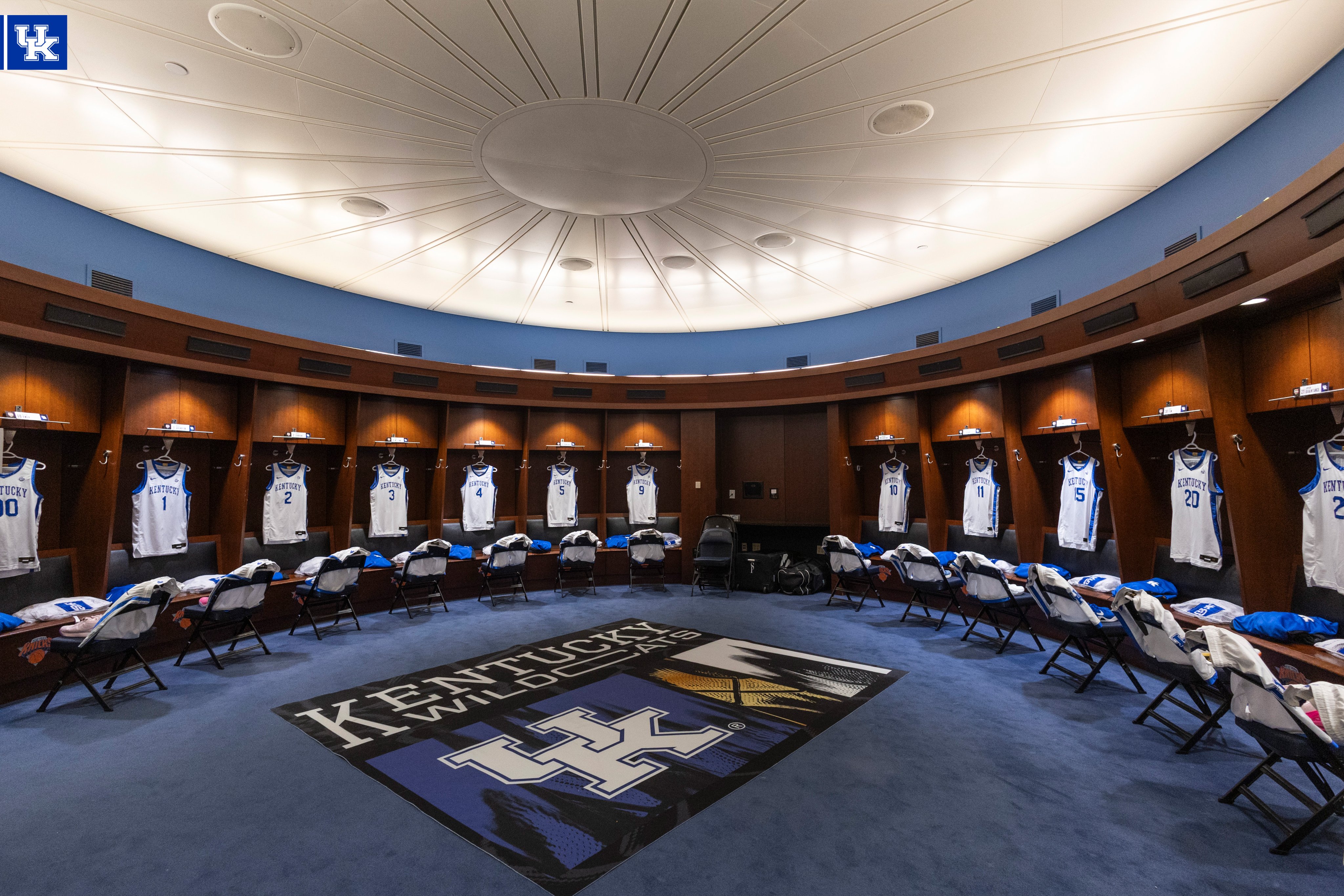 11/18/2025 04:48:16 PMThe Cats will be wearing their white home uniforms tonight. The Kentucky Wildcats rug in the middle of the locker room is a nice touch.