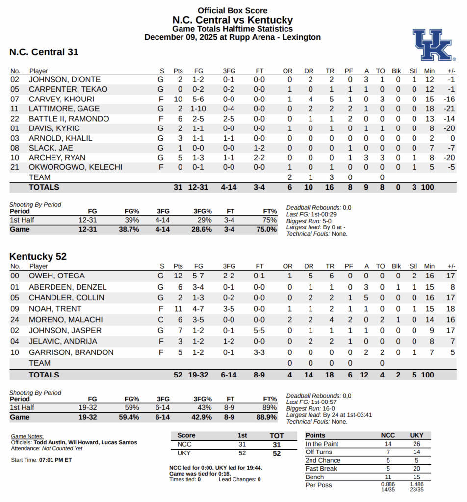 HALFTIME: Kentucky 52, NC Central 31