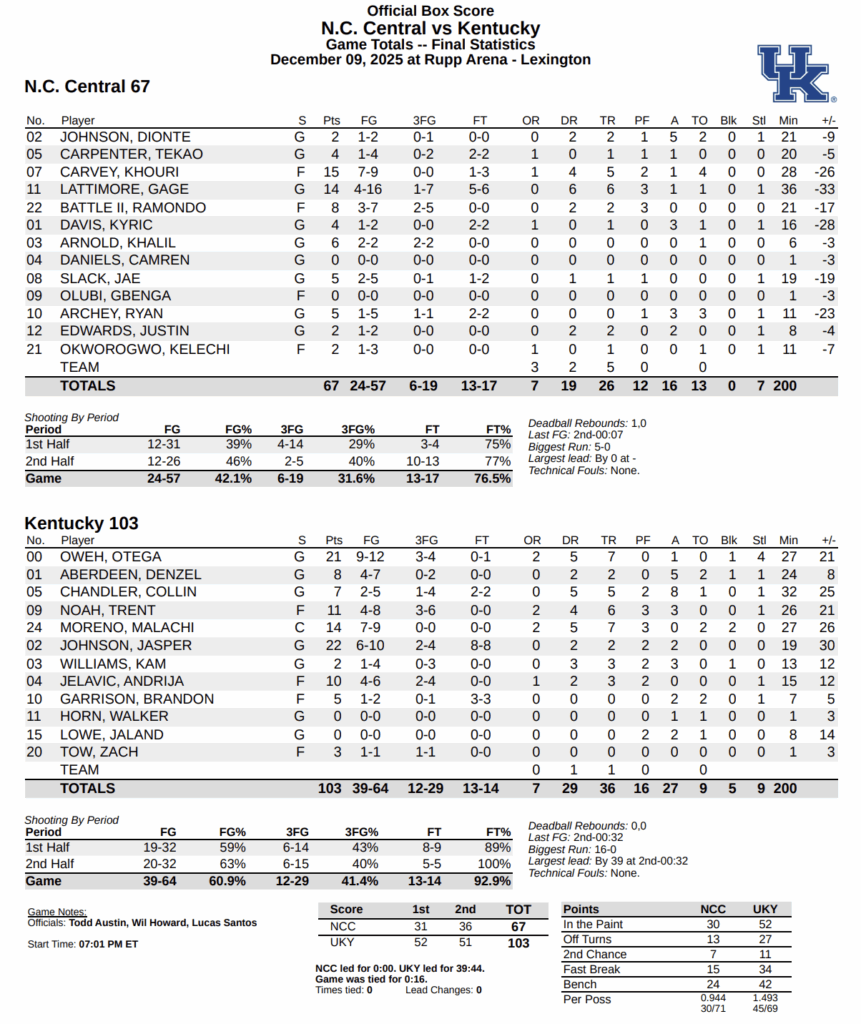FINAL: Kentucky 103, NC Central 67