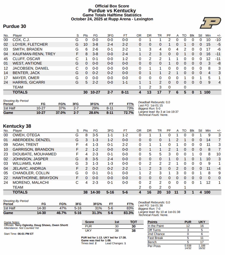 10/24/2025 05:47:17 PMAfter 20 minutes of play, Kentucky leads Purdue, the No. 1 team in the country, 38-30. Otega Oweh and Jasper Johnson lead the Cats with eight points each, while Mo Dioubate has a game-high five rebounds. Kentucky is shooting 47% (14-30) from the field and 31% (5-16) from three-point range. Purdue is only 37% (10-27) from the field, 29% (2-7) from the outside. Kentucky has 11 fastbreak points to Purdue’s 5.