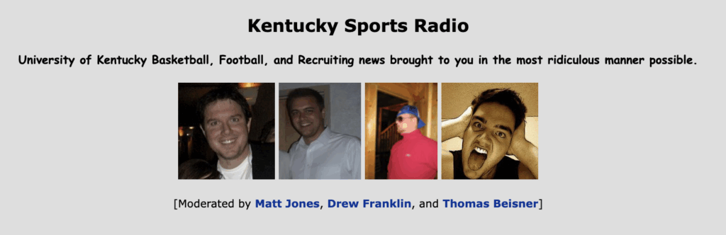 Kidding aside, it’s pretty incredible that a blog born in a Lexington basement in 2005 has endured two decades’ worth of changes, not only in the subject we cover (University of Kentucky sports, mostly), but in the industry we ended up revolutionizing, at least on a local level. Matt Jones, Andrew Jefferson (aka “Hubby”), and Rob Gidel started Kentucky Sports Radio, the website, with hopes of getting a radio show with the same name. That eventually happened, but not before the blog developed a cult following, fans latching on to Matt, Rob, and the hilarious cast of characters’ (aka Matt’s friends) musings on Kentucky basketball, football, and more.