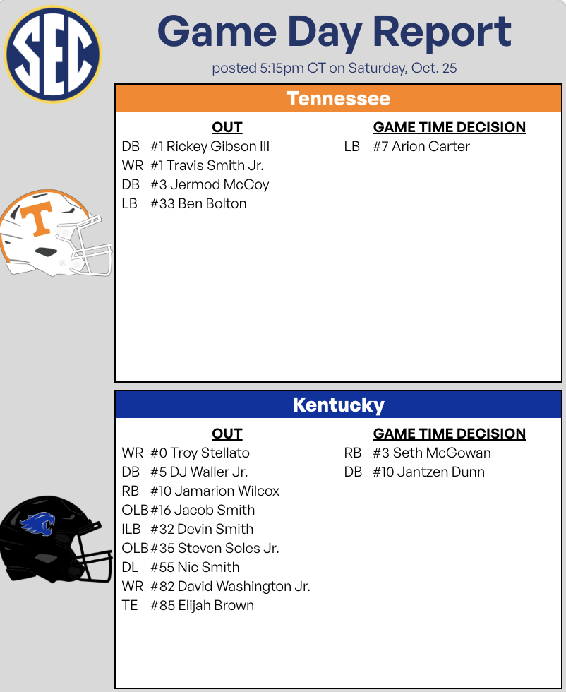 10/25/2025 06:31:51 PMKentucky tailback Seth McGowan and Tennessee linebacker Arion Carter were both listed as game-time decisions after spending all week with a questionable designation on SEC’s availability report. McGowan was full speed throughout warmups. Carter is reportedly dealing with turf toe and is not expected to play.
