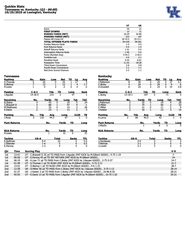 10/25/2025 07:36:36 PMThe Kentucky defense has played well about 90% of the time. The other 10% of the time is just so, so bad. Kentucky will get Tennessee on its heels, stuff the run, and put pressure on Aguilar, until the quarterback dials up a bomb. Just like that, the Vols are rolling.