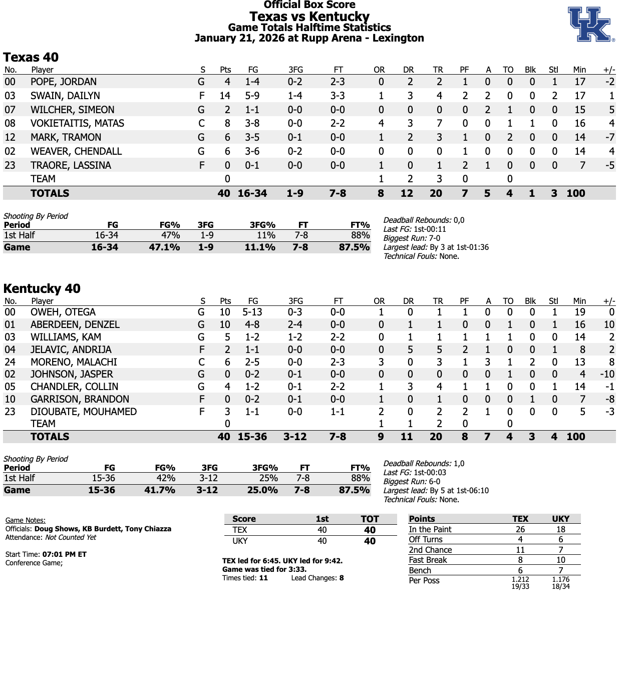01/21/2026 06:49:46 PMTrading baskets there to end the half will bring us to a tie at the break, Kentucky and Texas even at 40-40 through 20 minutes. We’ll take it after the last week for these Wildcats.