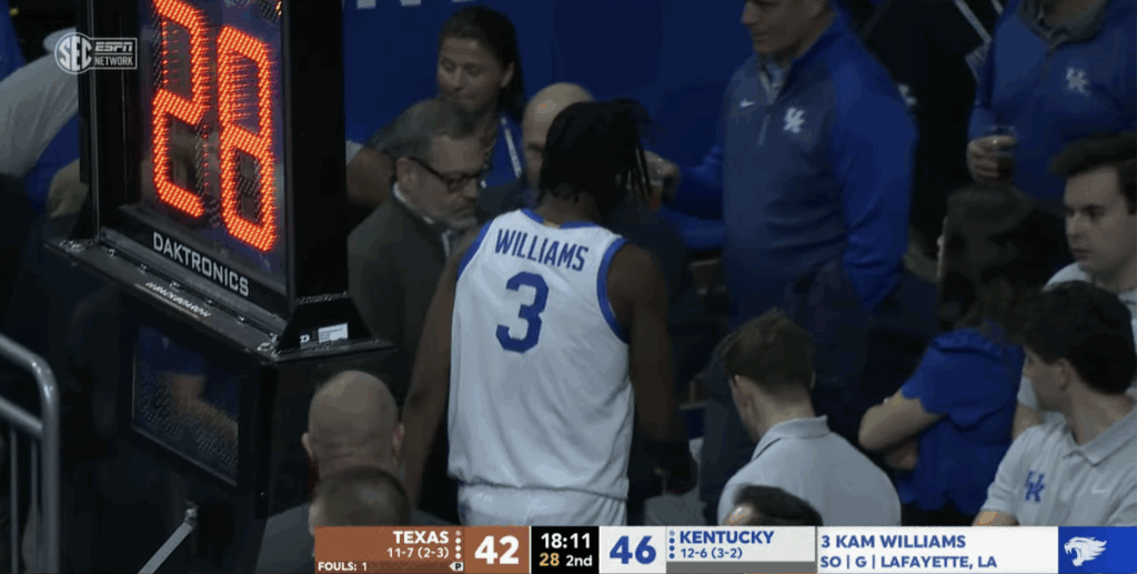 01/21/2026 07:10:13 PMOne second, Kam Williams was shooting free throws, and the next, he was hobbling down the court. Williams checked out and went straight to the locker room with just over 18 minutes to go. It’s not really clear what happened, but hopefully, the sharpshooter is okay.