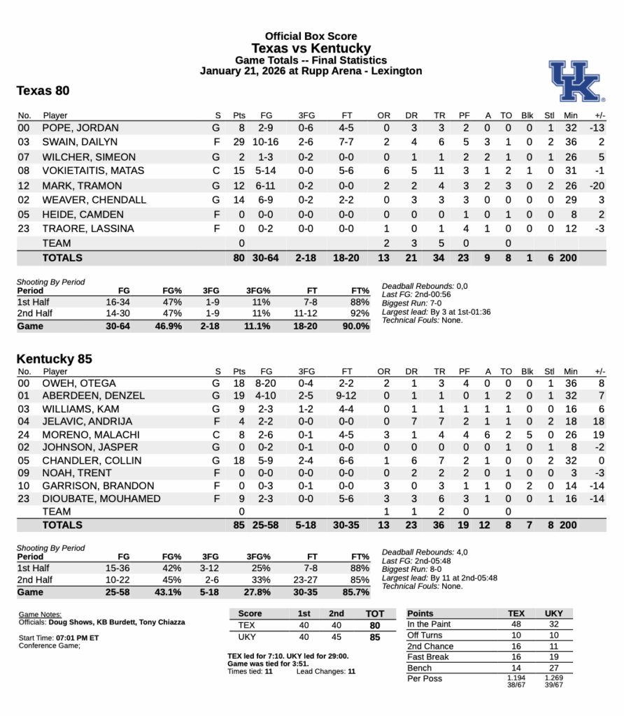 FINAL: Kentucky 85, Texas 80